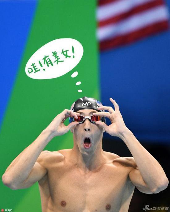 不仅如此,菲尔普斯在调整泳镜的时候,东方IC再次脑洞大开,将文字“哇!有美女”Ps到了菲尔普斯的照片上。