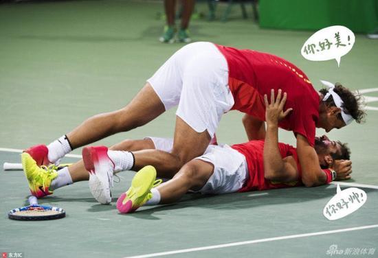 北京时间8月12日,2016奥运男双网球半决赛,纳达尔和队友洛佩兹凭借两盘抢七大战7-6(1)/7-6(4)拿下加拿大组合内斯特/波斯皮希尔,成功进入决赛。比赛胜利后,纳达尔转身将洛佩兹扑倒在地,紧紧拥抱,忘情庆祝。