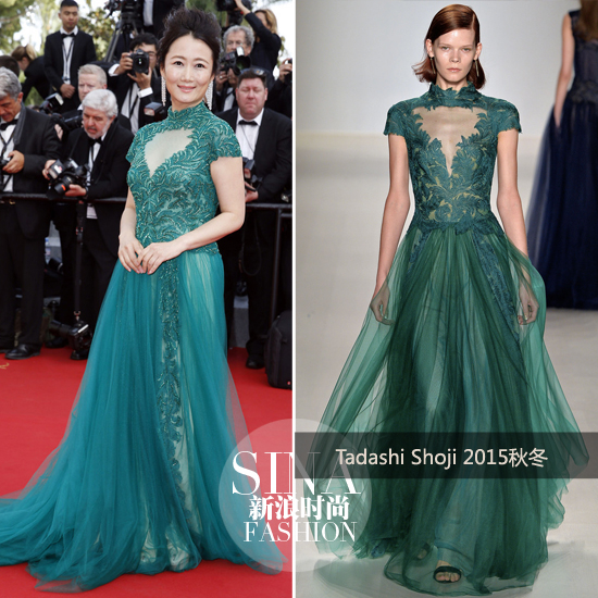 虽然名气没有上面几位大,但赵涛绝对是戛纳电影节元老级人物,早在2002赵涛就凭借贾樟柯导演的《任逍遥》第一次亮相戛纳红毯,这次凭借同样贾樟柯导 演作品《山河故人》四度亮相戛纳。毕竟人家是冲着影后来的,在着装方面反而没有那么拼,Tadashi Shioji 墨绿色礼服大气得体,胸前的镂空也不显艳俗,这样的穿着在戛纳红毯上反而有种“你们慢慢斗艳,我要去忙着拿奖了”的超脱。
