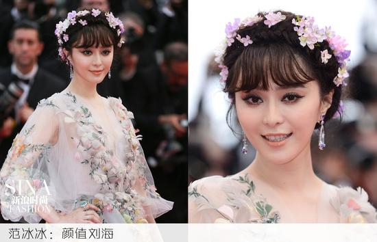 这款“花仙子”造型也是今年戛纳范爷被热议最多的造型。整个造型被一片美丽的花朵装饰起来,头上的小朵花瓣也增添了几分清新甜美的气质。在发型方面,一贯喜欢露出额头的范爷却选择了一款提升颜值的空气刘海,上演绝技“侧颜杀”!