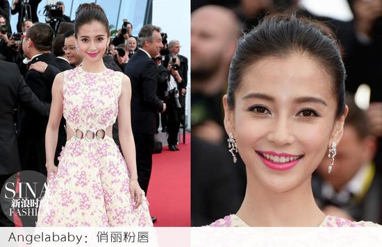 与两位冰冰的女王范儿不同,baby的红毯造型更加倾向于年轻又时尚的公主范儿。今年的红毯她依旧选择了利落又年轻的高盘发,与粉色服装相搭配的是俏丽又鲜艳的玫粉色唇妆;卷翘美睫和眼头的提亮也让双眸看上去更加有神采。