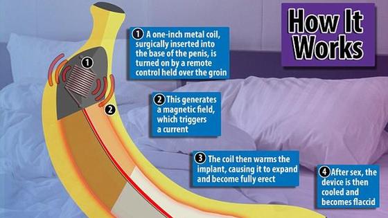 美国威斯康星大学的专家发明了一种远程控制的仿生阴茎装置,此装置采用镍钛合金制成,在不同温度下可呈现出不同的形状,且加热至42 ℃时,其长度可延伸至8英寸(20厘米)。与现有假体相比,此装置无需泵或储备即可产生机械力,激发阴茎的勃起。