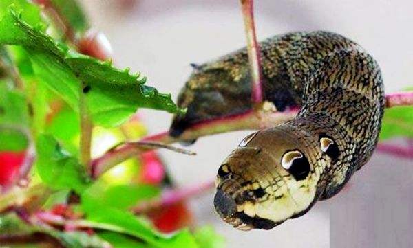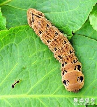 生物资料显示,象鹰蛾双翅伸展长度可达3英寸左右,其名字来自于它的幼虫在吃东西时需要拼命伸长身子,看上去很象大象的鼻子,所以有了这个称号。更为神奇的是,当它的幼虫受到惊吓时就将“象鼻”缩回,在身上斑点的装饰下,整条毛毛虫会伪装成蛇的样子,以避免受到攻击。