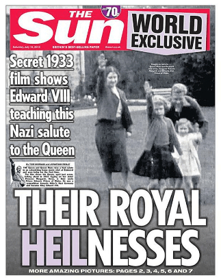 摘要|17日,《太阳报》刊登了英国女王伊丽莎白7岁时候行纳粹礼的视频和照片,并且在标题《王世殿下们》(THEIR ROYAL HEILNESSES)中故意将“殿下”一词(highness)写成(Heilness),这个词是纳粹致敬口号“希特勒万岁”中的一部分,因此该标题也被普遍认为是影射女王及王室同情纳粹,报道后立刻引起了轩然大波,白金汉宫指责《太阳报》利用了英国王室,舆论也一边倒的认为《太阳报》越来越没有底线了。