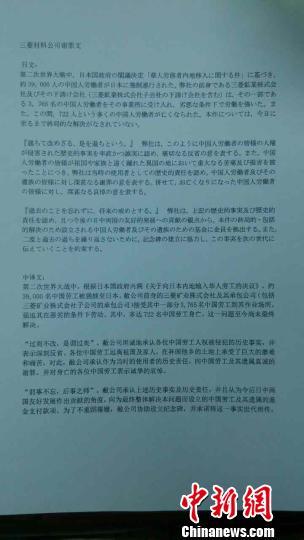 中国三菱受害劳工发表的声明全文。