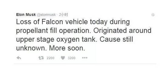 马斯克事故发生后发表的状态:加注推进剂过程出现异样导致损失火箭,异样起源自液氧罐,具体原因目前仍然不明,会尽快查清楚。