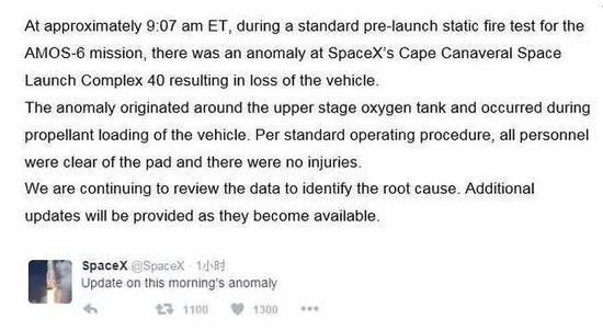 SpaceX在事故3个小时后给出的补充声明:发射台出现异样导致火箭发生事故。异常源于火箭上面级液氧储罐,当时正在按照标准程序加注推进剂,发射台没有人员受伤。SpaceX正在检查数据,寻找事故原因。