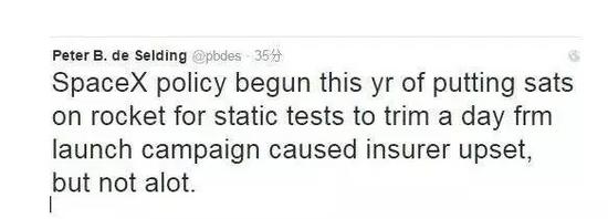 SpaceNews的Selding表示,SpaceX今年开始把卫星放在火箭上一起进行静态点火测试让保险公司不安