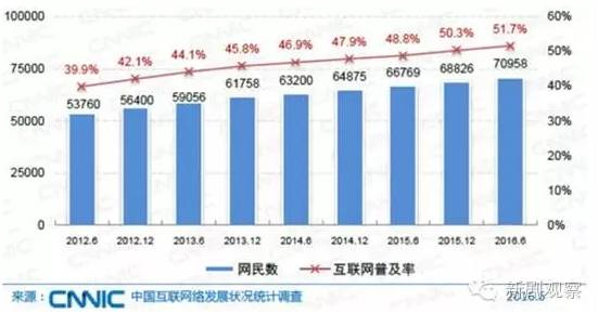 另一方面,网民数量则开始大幅增长,截止2016年6月,中国网民规模达6.88亿,互联网普及率达到51.7%,超过全球平均水平3.1个百分点。