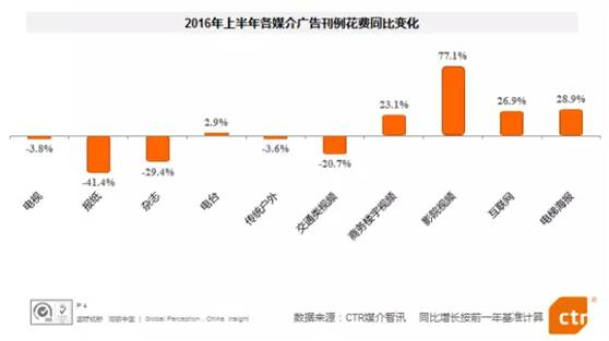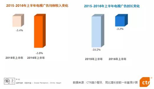 CTR市场研究最新数据显示,2016年上半年中国广告市场整体较去年同期有所好转,同比增长0.1%。但电视同比下降3.8%,市场份额逐渐被吞食。结合2015年同期数据对比,电视媒体广告收入、广告时长均持续下降,与纸媒一样同样陷入广告收入下滑的困境。