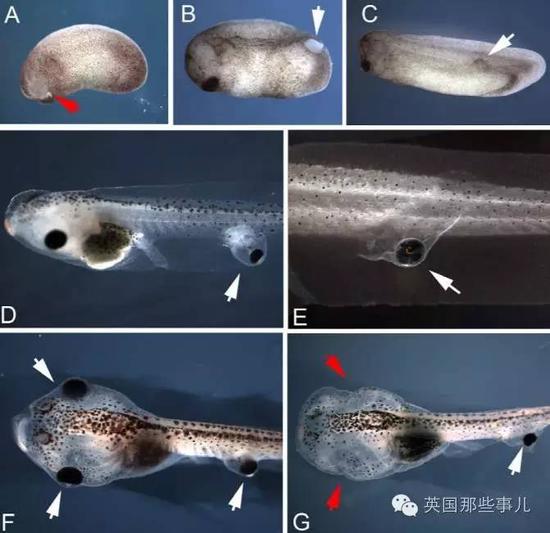 接着在蝌蚪的尾巴上挖一个洞,把一只眼睛植入到这个洞里,最终就能发育形成一个异位眼。