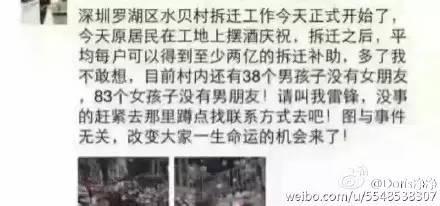 然后大家都在朋友圈纷纷求介绍水贝村的单身姑娘或少年,意图是什么大家想想就知道了…的确,每户2亿的赔偿金,多少人这辈子都赚不来,相亲成功可少奋斗20年!