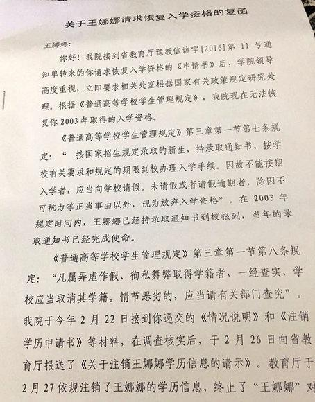 9月14日,王娜娜向周口职业技术学院邮寄《学籍恢复申请》。10月18日,周口市职业技术学院出具回函称:“在2003年规定时间内,王娜娜已经持录取通知书到校报到,当年录取通知书已经完成使命……你被冒名顶替上学的事实已公之于众,相关责任人已有相关部门处理……找不到恢复你入学资格的法律、法规和政策依据,无权恢复你的学籍。”