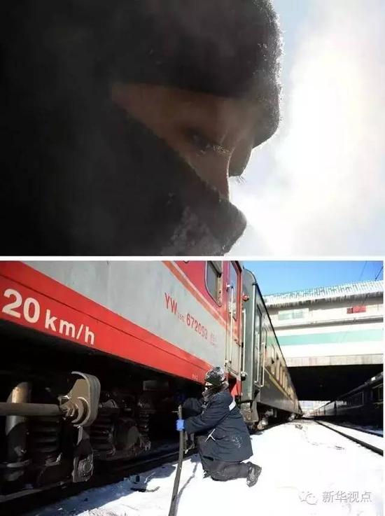 上图:在哈尔滨火车站,工作中的给水员黄娜睫毛上、帽子上挂着霜雪,11月21日摄);下图,给水员黄娜为列车及时供水,确保乘客用水方便,11月21日摄(新华社记者王凯摄)