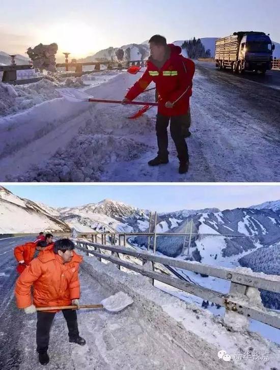 11月21日,新疆伊犁公路管理局果子沟分局工作人员在新疆赛里木湖——果子沟高速公路上清扫积雪。(新华社记者王菲摄)