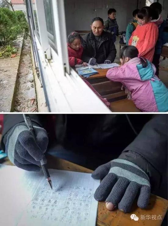 上图:在合肥市肥东县古城镇大陆小学的板房教室里,李章德老师在辅导学生做作业,11月22 日摄;下图:李章德老师在给孩子们批改作业,11月22 日摄。(新华社记者张端摄)