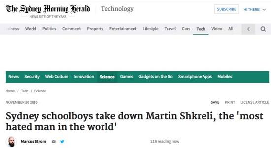 悉尼先驱者报则写道:“悉尼学生完胜Martin Shkreli 这个全世界最遭恨的人!”