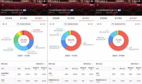 12月16日,《长城》迎来首映日。来自“电影资金办”的数据显示,这部突然提档的电影在首映日获得了1.09亿元票房,加上预售额,国内总票房达到1.57亿元。国师张艺谋的大作,各大院线自然没有慢待,大家均卯足劲、提前开跑、大规模排片,从15日晚上7点就开始霸屏。据猫眼电影的统计,当晚《长城》的全国排片率超过17%,往后几天的预排片率更是直线飙升。作为制片方传奇影业的拥有者,万达影业对《长城》的偏心从排片就能看出,周六万达院线的预排片达到惊人的71.3%,场次接近7000场。