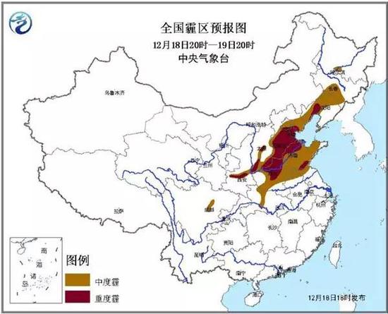 18日20时至19日20时,北京中南部、天津、河北中南部、山西南部、山东大部、河南中北部、陕西关中、辽宁中西部、吉林南部等地有中度霾,其中,北京南部、天津、河北中南部、河南北部、山东西北部和东南部、山西南部、陕西关中、辽宁西部等地的部分地区有重度霾,最低能见度为1公里左右。