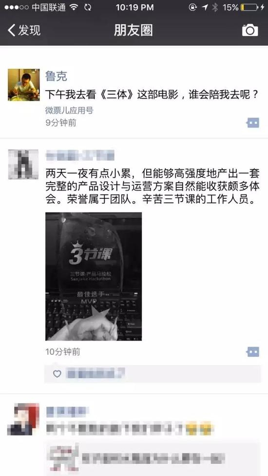 选择邀请好友,应用号在我的朋友圈中添加了一条状态:“下午我去看《三体》这部电影,谁会陪我去呢?”