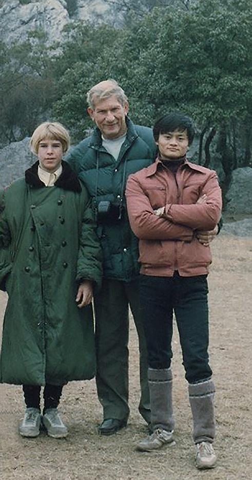后来,马云又邀请Morley一家来杭州做客。在杭州,同样的三个人合影中,已经能看出青年马云是个赶时髦的人,它的那条裤子即使放在现在可能也不过时,而David穿的军大衣延续至今仍然被人们买来御寒,见下图。