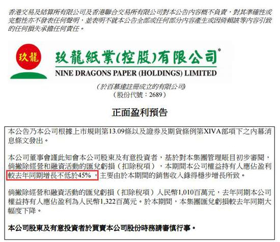 记者注意到,今年1月23日,玖龙纸业还发布正面盈利预告称,截至2016年12月31日止六个月,玖龙纸业权益持有人应占盈利较去年同期增长不低于45% ,主要由于本期间的销售收入录得稳步增长所致。