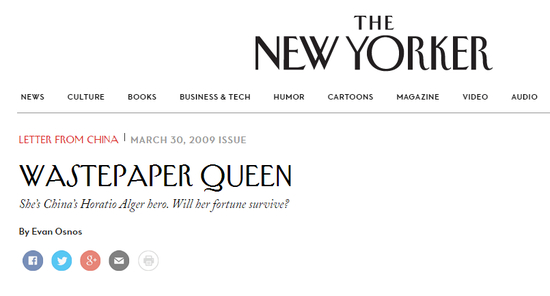“废纸女皇”(wastepaper queen),2009年美国《纽约客》杂志在报道中,给张茵冠上了这一称号。