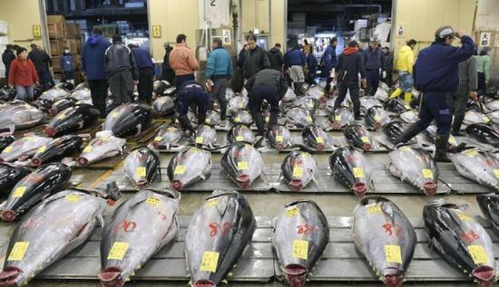 每公斤约合3000美元!2017年年初,日本东京筑地水产市场的新年拍卖,一条蓝鳍金枪鱼以7200万日元成交(约合61.4万美元)。