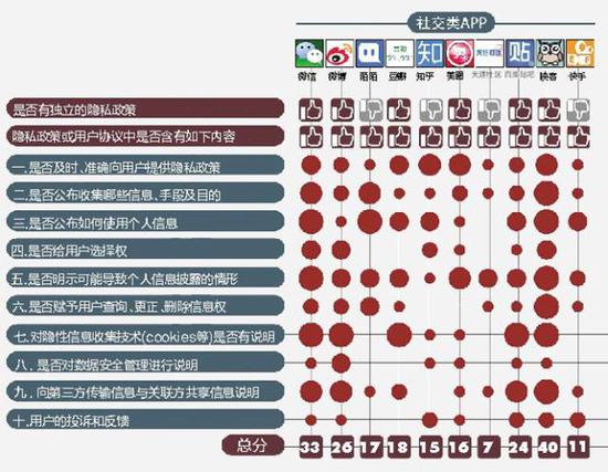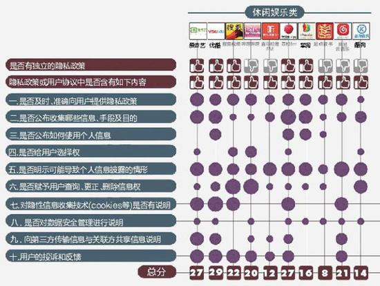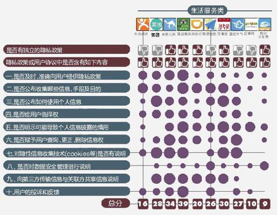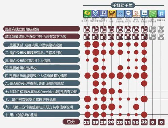 十项评分标准:是否及时准确提供隐私政策;是否公布收集信息的种类手段和目的;是否公布如何使用个人信息;用户是否有选择权;是否明示用户信息可能被披露的情况;用户是否有修改信息的权利;隐形信息收集技术是否有说明;是否对数据安全管理进行说明;向第三方或关联方传输及共享信息是否说明;是否设置投诉和反馈机制;
