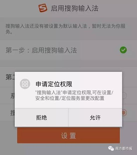 南都记者注意到,一些APP在获取用户敏感信息权限时会有单独提示。比如,在搜狗输入法APP中,当用户初次登录会收到这样的提示:“此输入法可能会收集您输入的文字,包括密码及信用卡号码数据。它源自应用搜狗输入法”。