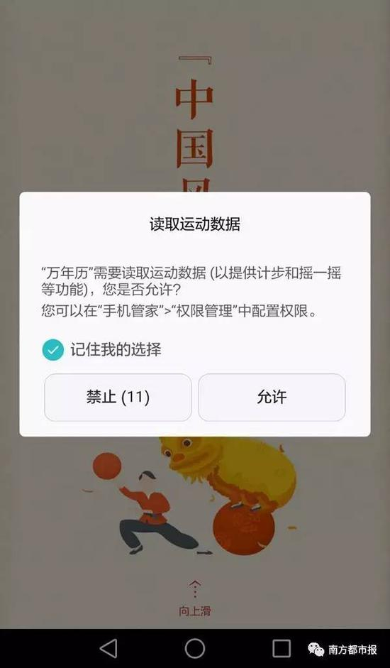 在万年历APP中,也出现“读取运动数据(以提供计步和摇一摇等功能),您是否允许?您可以在‘手机管家’权限管理中配置权限”。