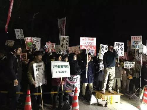 3月3日晚,示威者在日本国会大厦前抗议安倍政府。