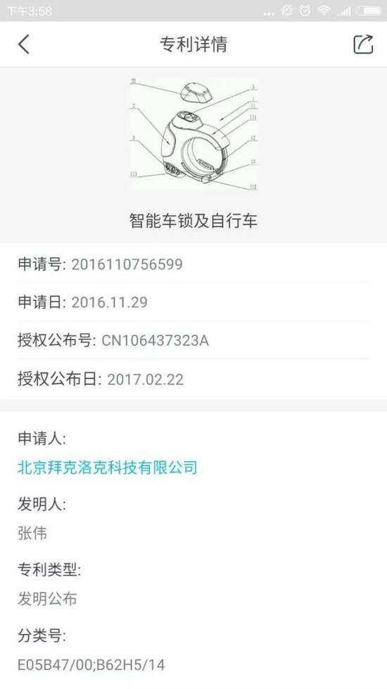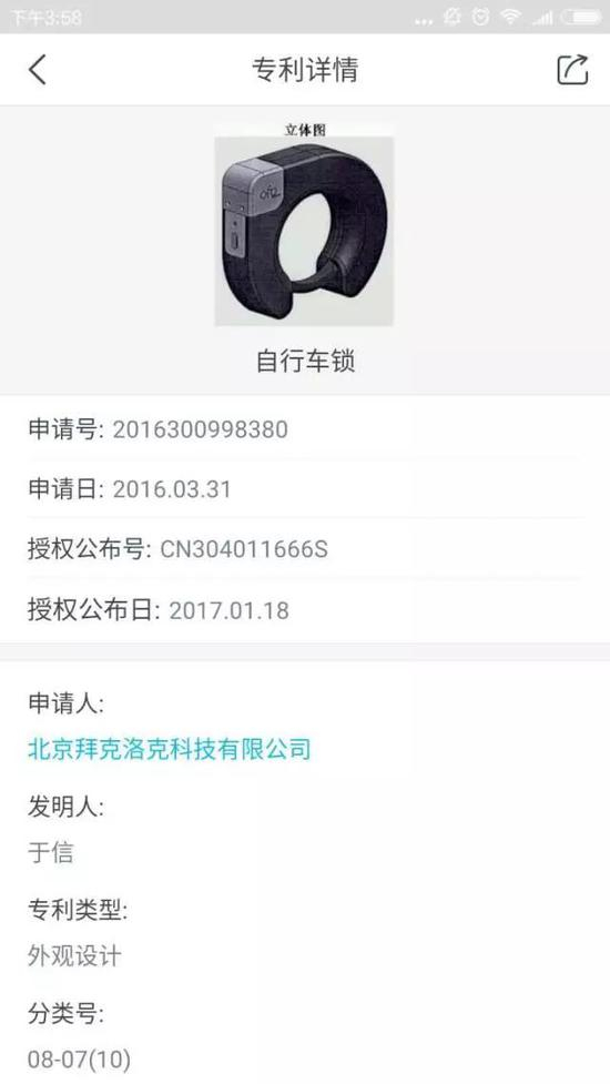 作为摩拜的强劲对手,ofo的运营主体“北京拜克洛克科技有限公司”所持有的专利只有5项。