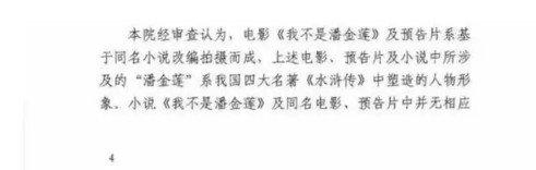 法院的判词似可翻译为:原告只是起了个与名著中人物形象潘金莲相同的名字而已,从法律上讲,同被告的小说与同名电影中提到的潘金莲没有关系,根本没有资格当原告。