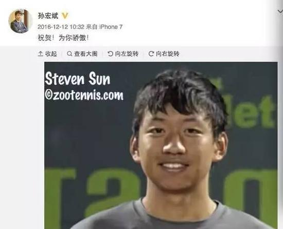 此前,曾有媒体报道称,孙宏斌有两儿一女。去年12月,孙宏斌发了一篇“祝贺!为你骄傲!”的微博,附带了三张一个网球少年的照片。其中一张照片上带有“Steven Sun”的名字。该少年参加的是16岁年龄组的比赛。