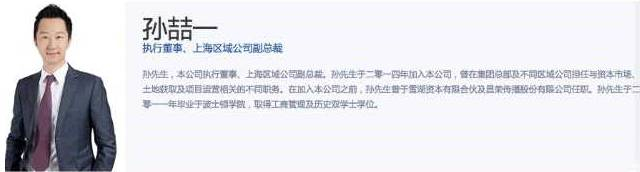“孙先生,本公司执行董事、上海公司区域副总裁。孙先生于二零一四年加入本公司,曾在集团总部及不同区域公司担任与资本市场、土地获取及项目运营相关的不同职务。在加入本公司之前,孙先生曾于雪湖资本有限合伙及昌荣传播股份有限公司任职。孙先生于二零一一年毕业于波士顿学院,取得工商管理及历史双学士学位。”