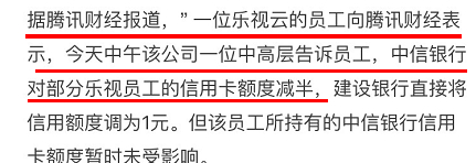 而另一家曾被媒体报道称“对部分乐视员工的信用卡额度减半”的中信银行则表示:“中信银行根据个人用卡及信用状况调整持卡人信用额度,而不会针对持卡人所在企业的经营状况来调整个人额度。”