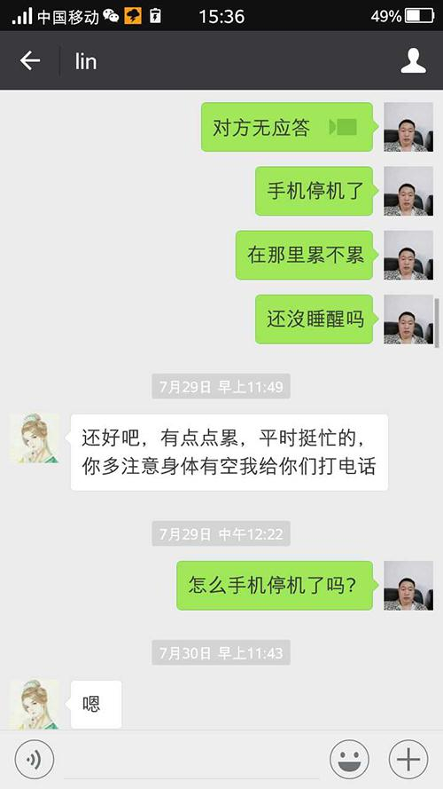 7月29日11时49分,林华蓉回复父亲,“还好吧,有点点累,平时挺忙的,你多注意身体,有空我给你们打电话”。